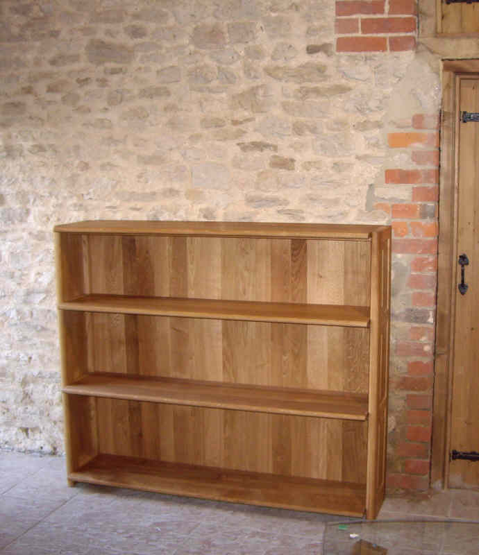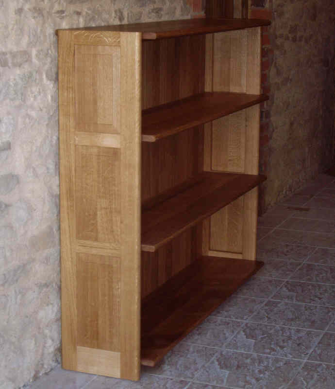 A substantial and elegant traditional 3 shelf book case with book matched quater sawn pannels on either end.